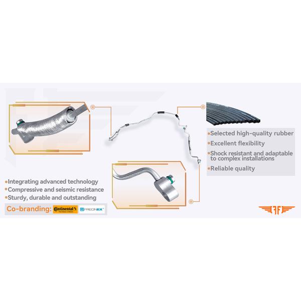Our air conditioning ducting is primarily constructed of aluminum, combined with highly flexible hoses, allowing it to bend and move easily in tight spaces. It seamlessly integrates with other components of the vehicle's air conditioning system, making installation a breeze. We use high-quality rubber or synthetic materials that are resistant to pressure, corrosion, and aging, and incorporate reinforced braiding to ensure excellent pressure, vibration, and weather resistance, making it easily resistant to complex road conditions and extreme temperatures. We understand that safety is paramount and strictly adhere to industry standards to provide you with a long-lasting, stable, safe, and worry-free air conditioning system.